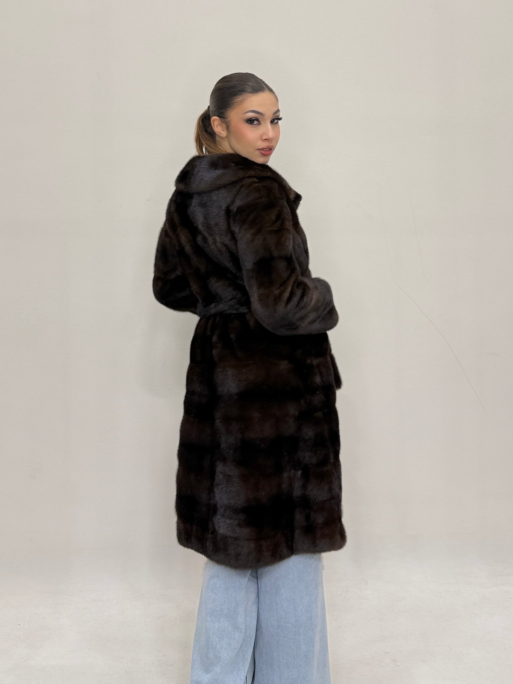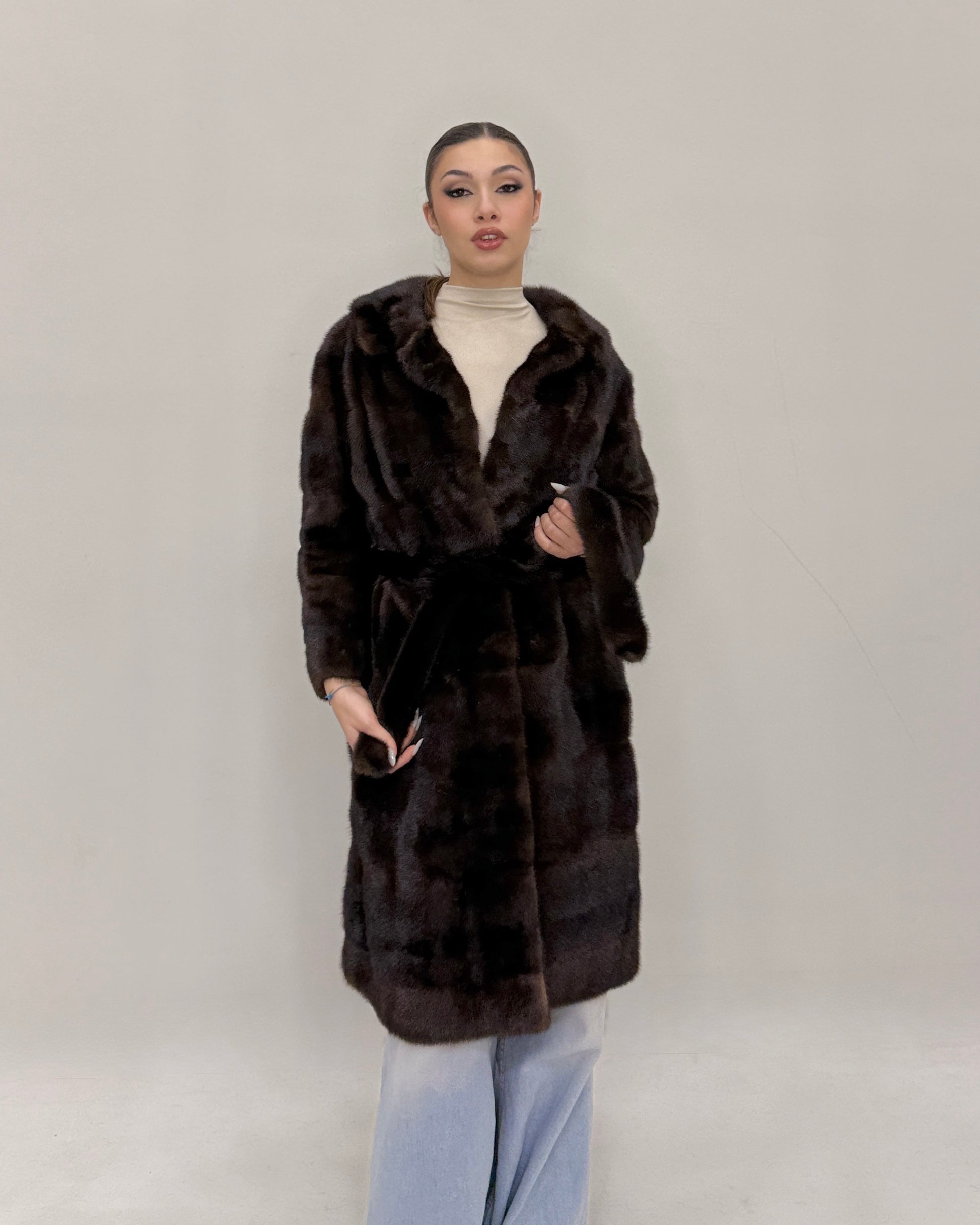 Pelliccia in visone lavorazione orizzontale , una linea equilibrata che unisce eleganza e versatilità. La pelliccia presenta diverse gradazioni di visone in quanto la lavorazione del capo rende più naturale possibile il colore originale .