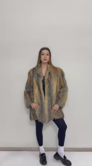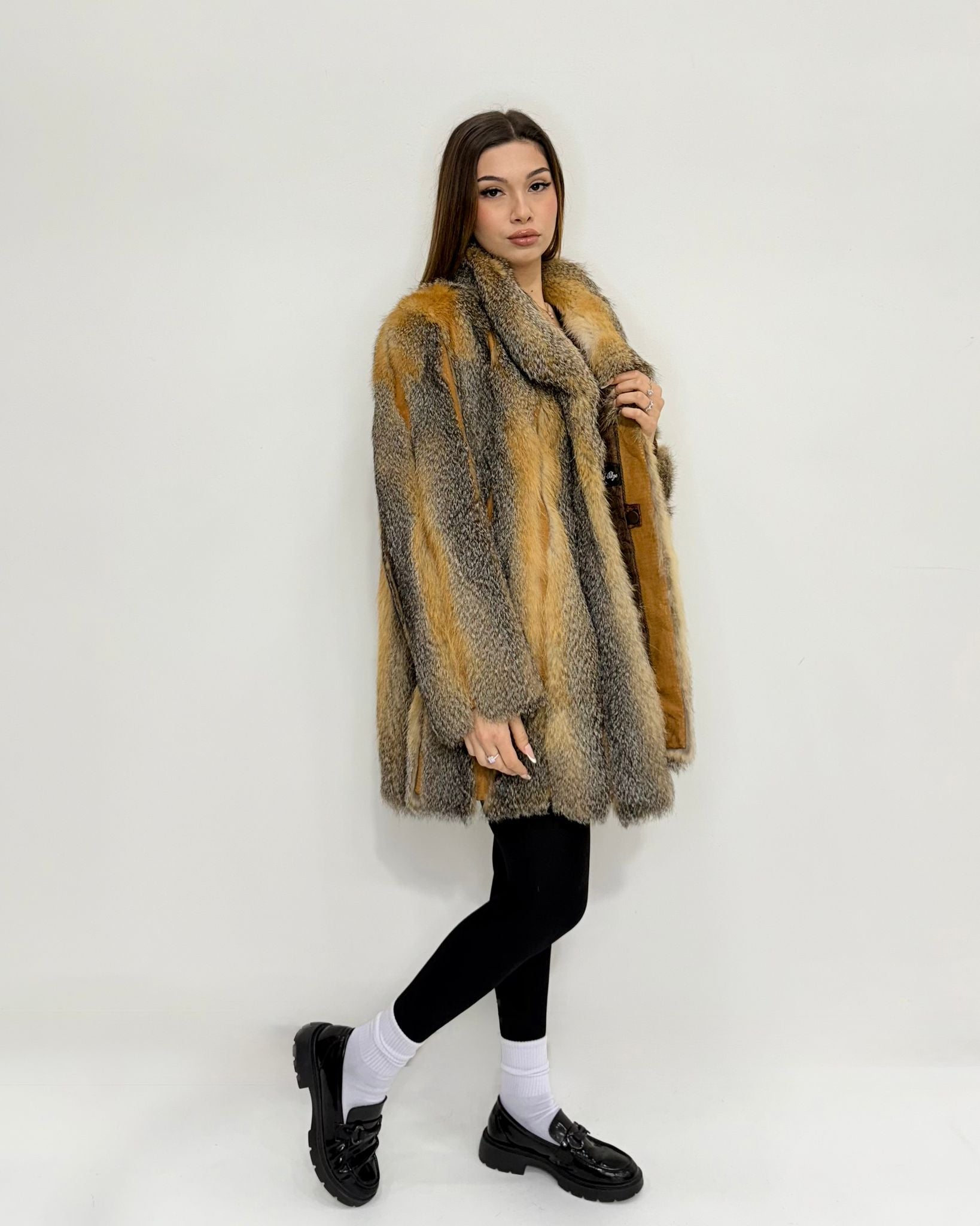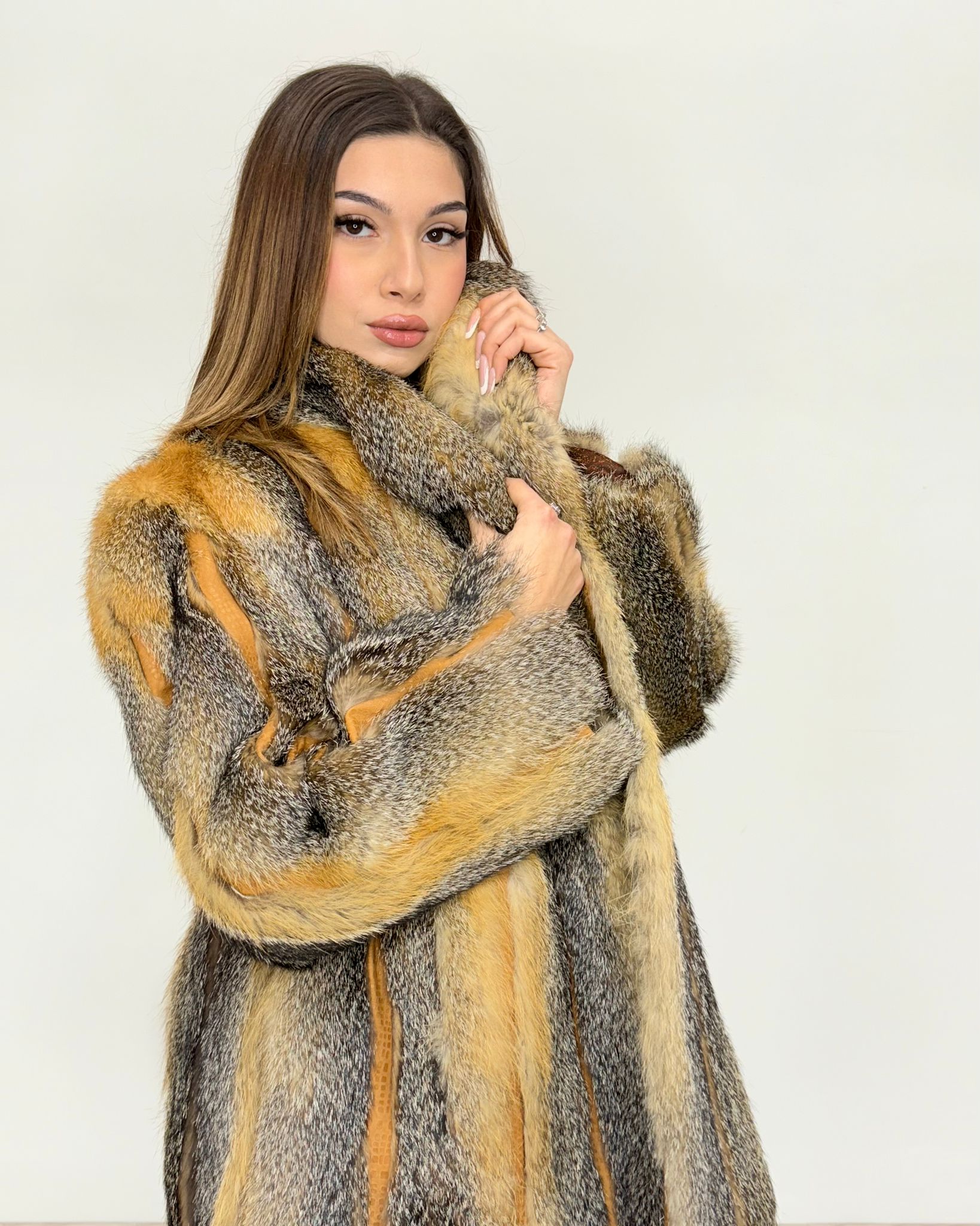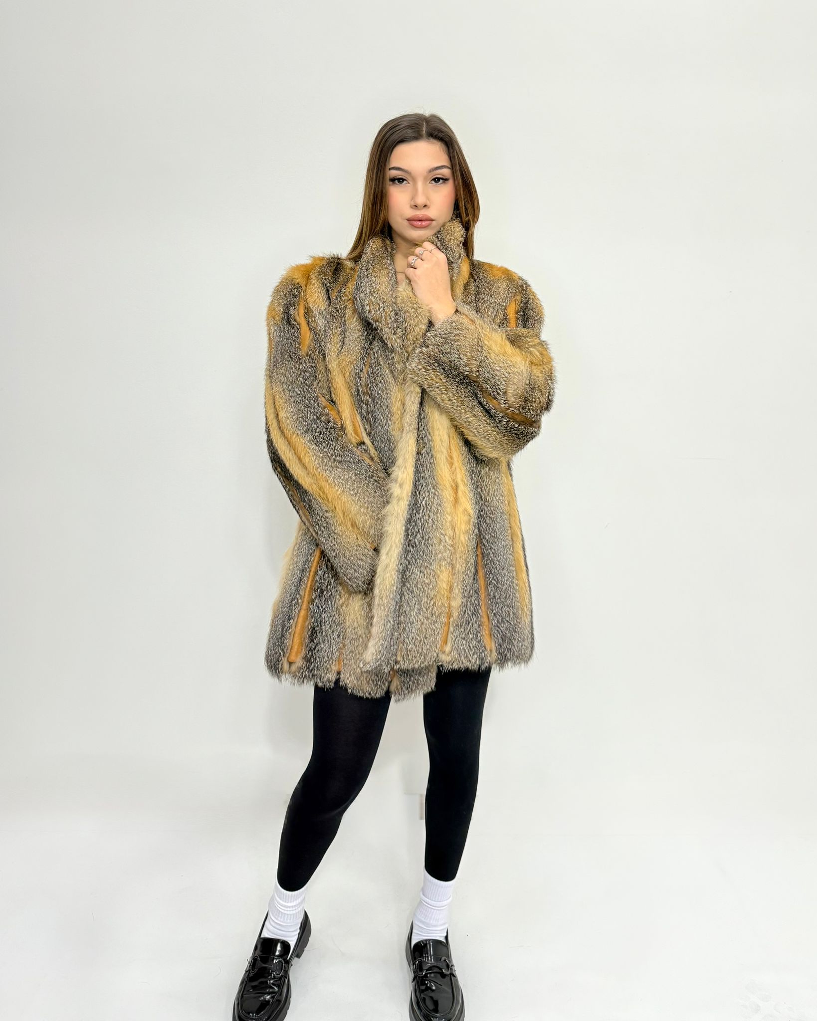 Pelliccia in volpe di Patagonia autentica rigenerata, impreziosita da raffinati inserti in pelle che donano al capo un carattere contemporaneo e distintivo. Il contrasto tra la morbidezza voluminosa della volpe e la struttura elegante della pelle crea un equilibrio perfetto tra lusso tradizionale e design moderno.